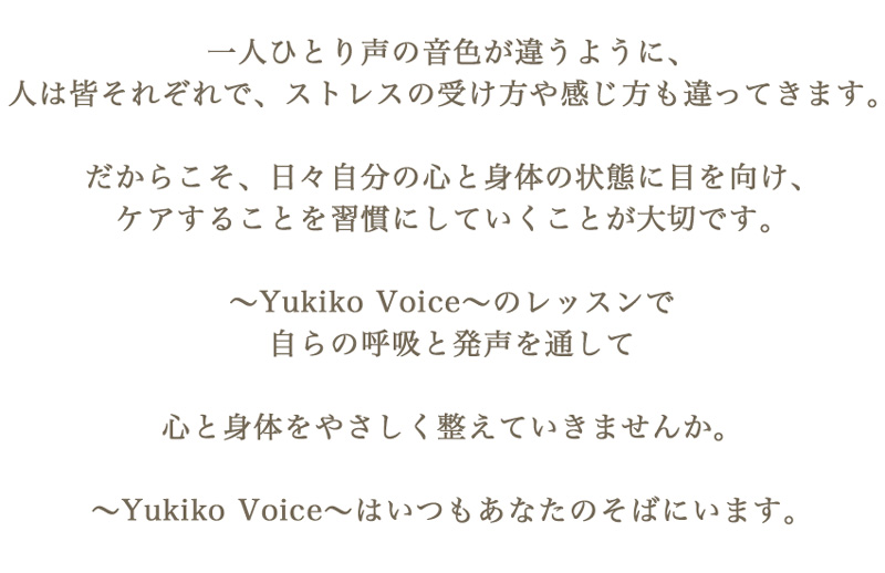 So, taking a moment each day to gently listen to your mind and body, and care for them, is so important. In the ~Yukiko Voice~lessons, you are welcome to gently harmonize your mind and body through your own breathing and vocal exercises.